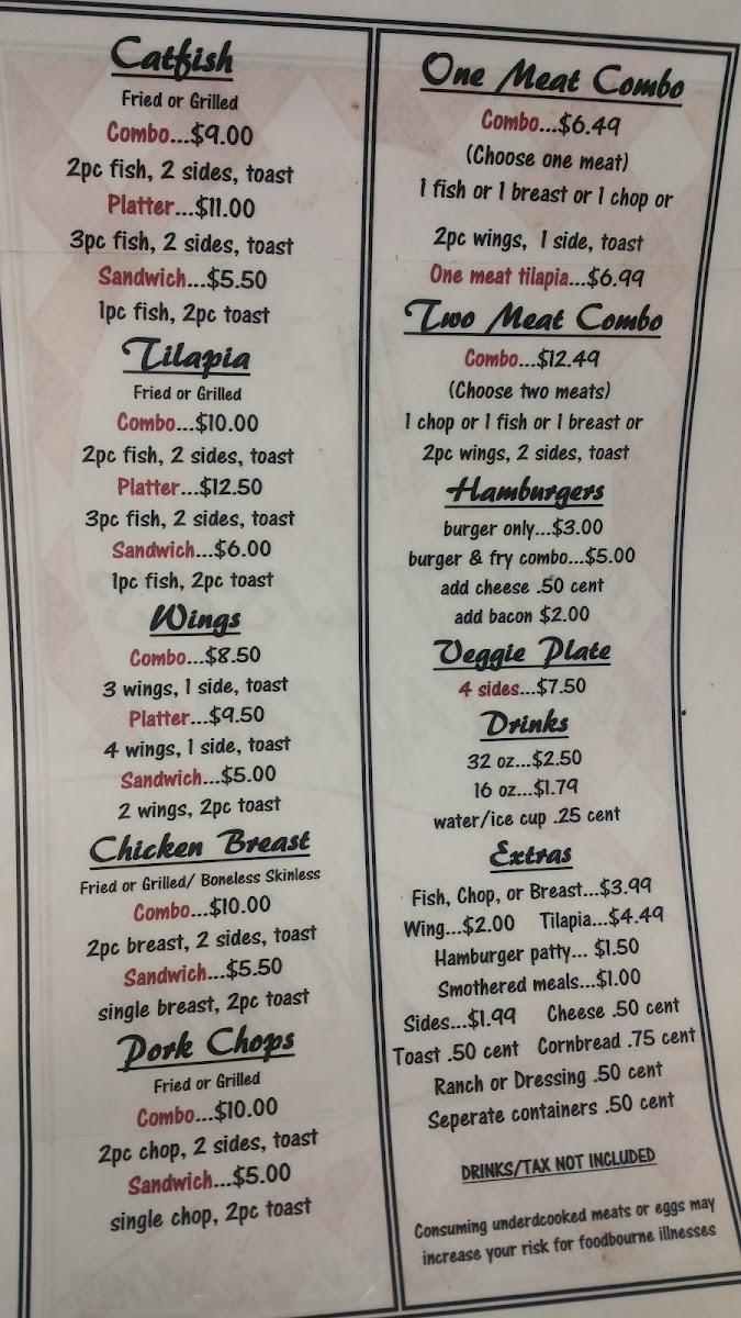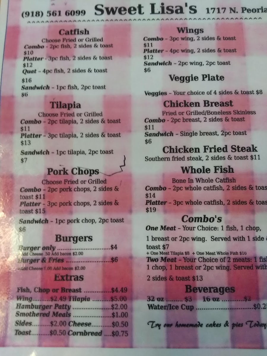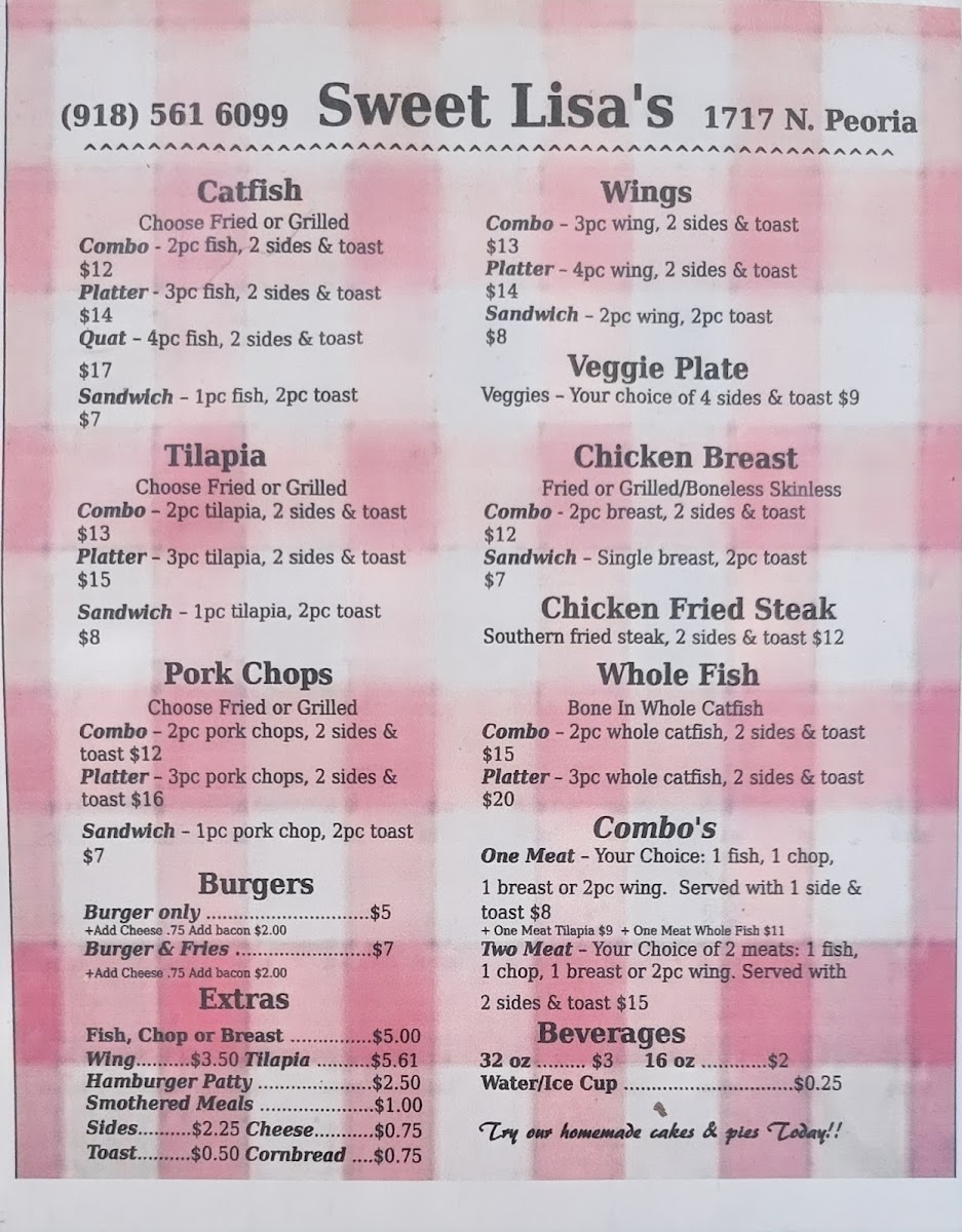 Sweet Lisa’s Cafe offers a menu rooted in classic soul food with familiar American favorites, designed for comforting and satisfying meals. The selections range from hearty dinners like fried catfish and chicken fried steak to simpler staples such as hamburgers and fries, creating an inviting atmosphere where casual bites and home-style cooking come together.